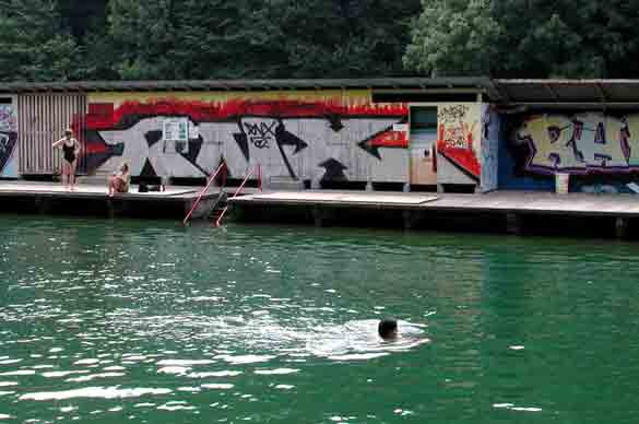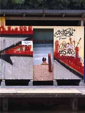 intervention: umkleidekabine dusche, blache no 2 aus bildserie <tinman's watering-place> 2002 no 1 (90 x 210cm), inkjet auf blache