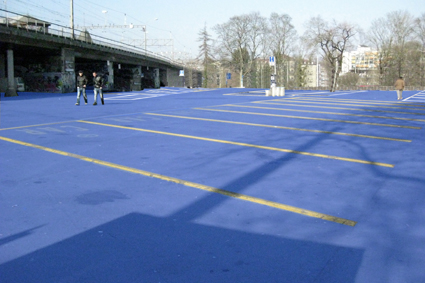 20-40 Personen in schwarzer Kleidung schraffierten die Schützenmattparkplatzanlage mit blauem Klebeband und transformierten diese in eine Planskizze.